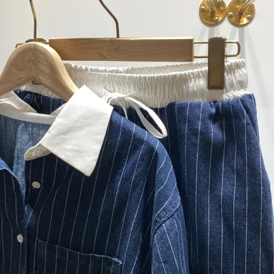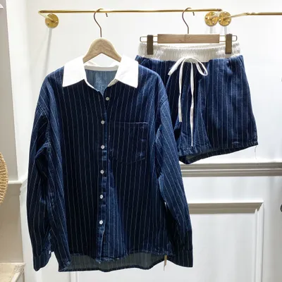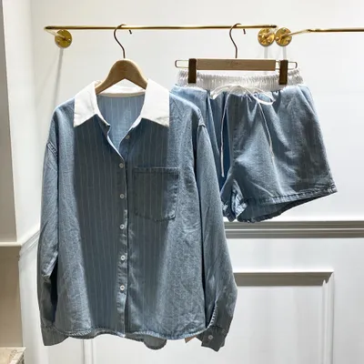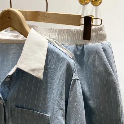 OI004 直條牛仔襯衫+短褲套裝
