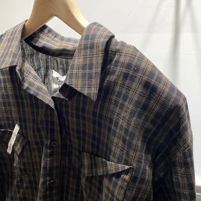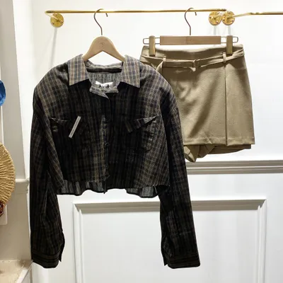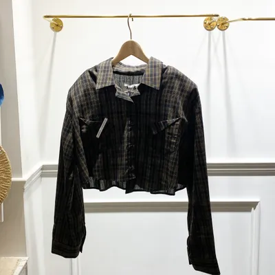 TJ021 格紋標籤墊肩襯衫